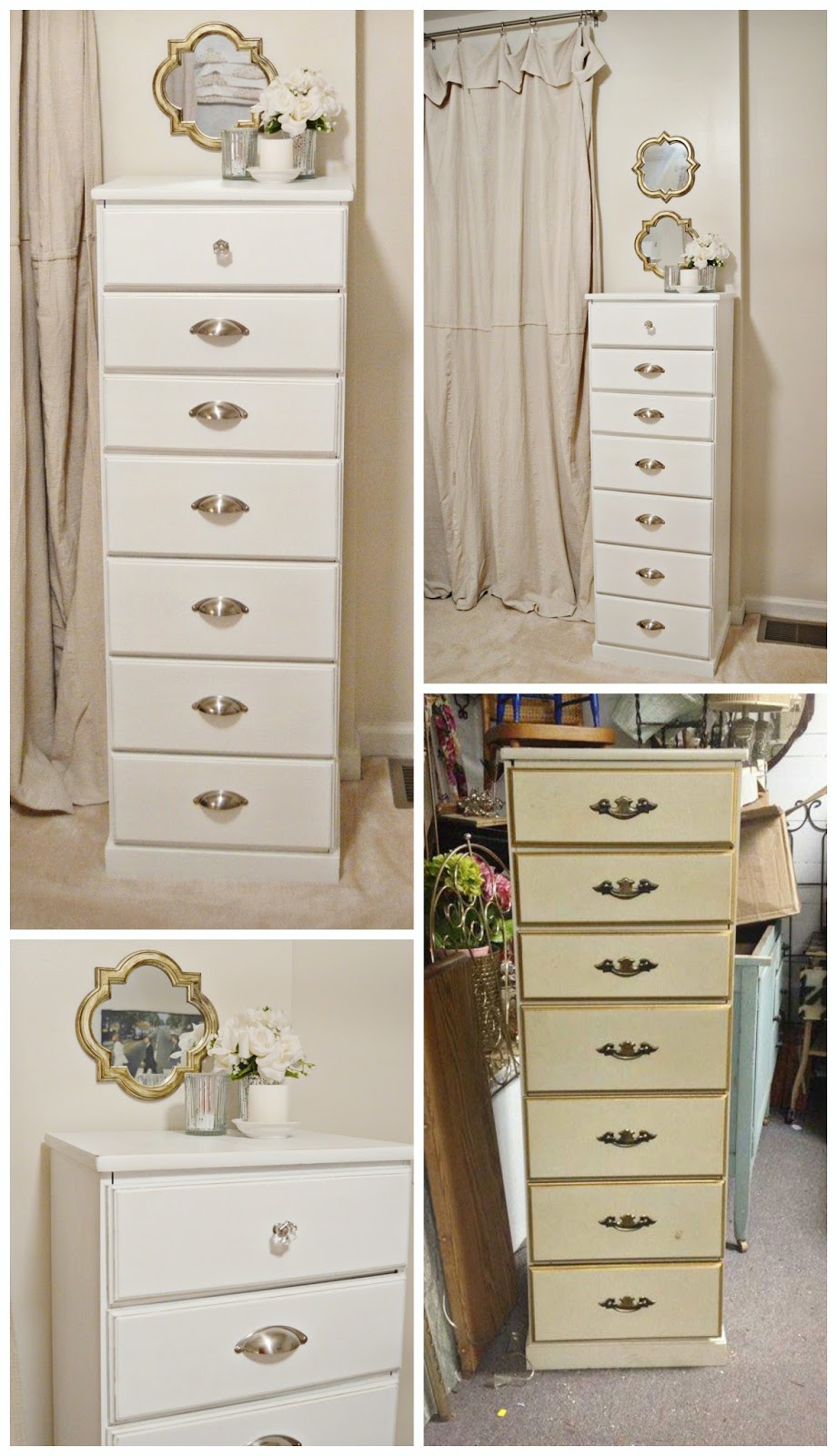 I found a little cabinet at Home Goods in the kids section. It had ABC's as pulls on the drawers that I pulled off and painted over then added true drawer pulls. Now it holds the bath tissue.
